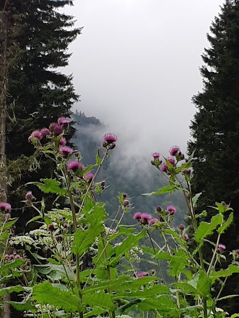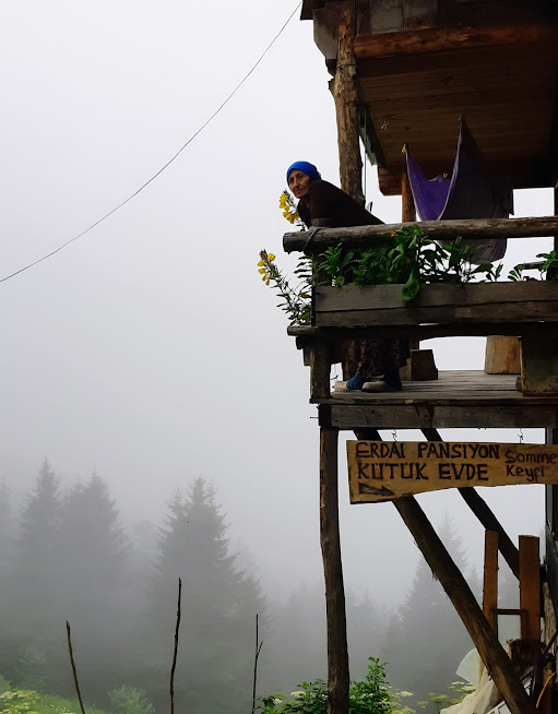 Meryem hanım bir sonraki misafirlerine hazırlana dursun biz yeniden düştük yollara. Yine çisenti başladı, yollar çamur, görüş mesafemiz belli belirsiz dağ zirveleri ve yol kenarlarındaki çiçekler kadar. Bulutlardan da yukardayız. Uzaktan, tüten ormanın az ilerisinden Pokut yaylası göründü. Artık neredeyse göz gözü görmüyor, büyülü bir gerçeklikle iç içeyiz sanki. Yine çatısı teneke saçtan tahta evler, tül perdenin arkasındaymış gibi fulü çiçekler, inekler, tosunlar ve tek tük insan silüetleri.